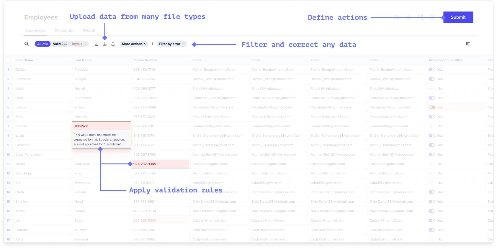 Workbooks are analogous to a database, and like a database, they are configured with a type-strict schema. A Workbook replaces the spreadsheet template you may share with your users today when requesting data during the data collection phase of customer onboarding or other file-based data exchange processes. Unlike a spreadsheet, it’s designed to allow your team and users to validate, correct, and import data with real-time feedback.
